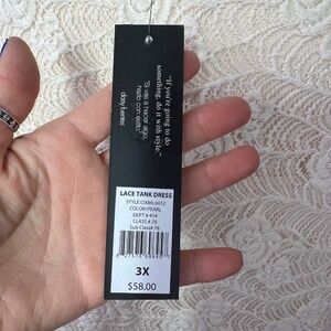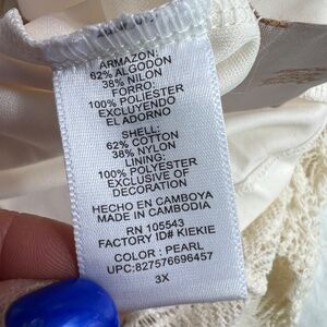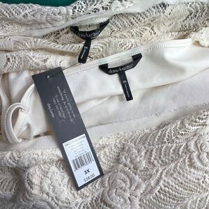 Brand new with tags. Really pretty ivory/cream dress. Lace/crochet outer, fully lined in ivory as well. Size 3X. Approximate measurements in inches when laid flat: chest 22.5 across pit to pit, full length 40. Photographed on a size 14 -16 dress form, will look even better on a better fit! :)