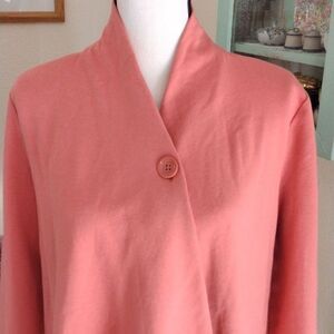 NEW Cozy sweatshirt material. One button closure with an "A" shape. Longer at the sides. Size S, please see these measurements 42 at chest, 46 at bottom hem. 30 long on the sides 24.5 in front. Very comfortable and a beautiful color.