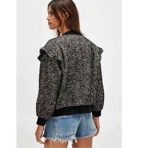 **Fit: ** Relaxed, slouchy fit * *Features: * * Ribbed hems, zip-front closure, ruffle detailing at front, slightly exaggerated sleeves **Why We Driftwood Houndstooth Bomber Jacket