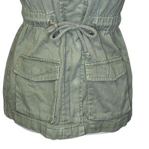 Stay stylish and comfortable with this versatile green utility vest. Perfect for layering, it features a drawstring waist for a flattering fit. Ideal for casual outings. Has zipper and snap button closure. Two usable snap closure pockets at top and bottom of front.
