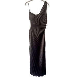 NWT Delfi Collective Solie Pleated One-Shoulder Cutout Sheath Gown Black Maxi