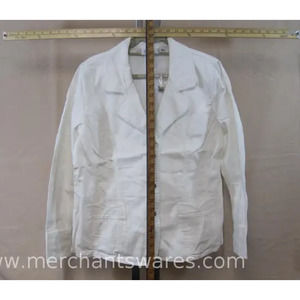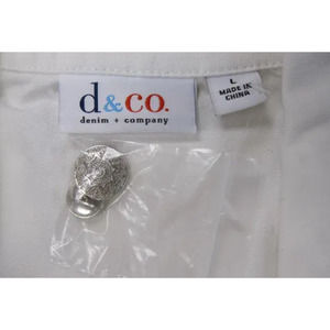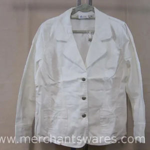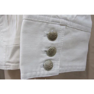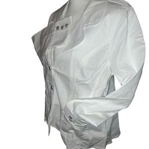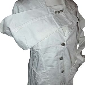 New With Tags - Denim & Co Women's Large White COMPY COTTON and SPANDEX stretch- Three Buttons on front and sleeves - gorgeous! Stretch Denim Blazer with Silver Tone Buttons
