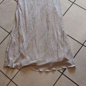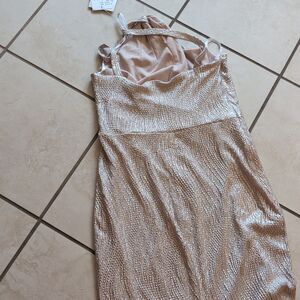 New with tag Dessy Collection Style 3064 One-Shoulder Twist Metallic Trumpet Gown in Rose Gold. Size 10 please see measurements pictures to be sure of fit. Retail: $231
