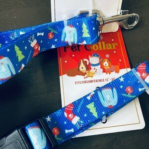 NWT 2-pc dog pet collar and leash set. Adjustable, Fits neck circumference 12”-20”. Bright blue background with Christmas stockings, trees, stars, snowflakes, bones and sweaters print.