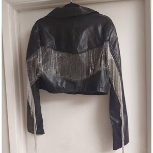 This luscious black vegan leather cropped moto jacket has long sleeves, front zipper and silver snap button accents, and sparkling diamond cut silver fringe along the back and down the back of the sleeves.