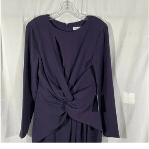 wedding guest dress, modern elegance, minimalist formal gown, purple maxi dress, jewel tone dress, draped silhouette, chic evening wear, deep hue fashion, NWT formal dress, peep detail neckline, elegant floor-length dress, long sleeve, 3/4 length sleeve, amethyst, crepe, knit
