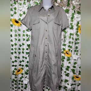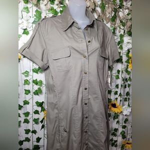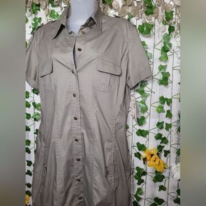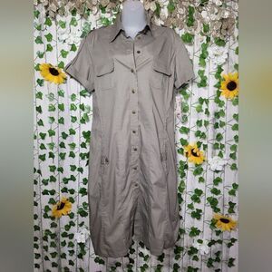 Buttons up the whole front of the Dress. There are belt loops but there isn't a belt.