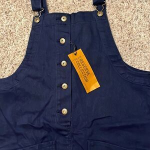 This is made by Duluth Trading Company. It’s a navy blue overall dress with 2 front pockets and buttons. Size small and NWT. Smoke and pet free home.