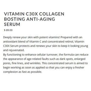 Deeply renew your skin with potent vitamins. Prepared with an antioxidant blend of vitamin C and retinol, Vitamin C30X Retinol Serum protects and renews your skin to keep it looking young and rejuvenated. By functioning to enhance cellular turnover, the formula can reduce the appearance of age-related faults such as dark spots, enlarged pores, fine lines, and wrinkles. The concentrated serum is aimed to begin working as soon as applied so that you can enjoy a fresher complexion as fast as possible.