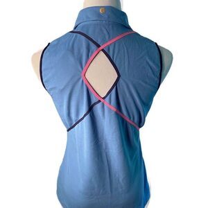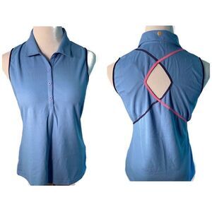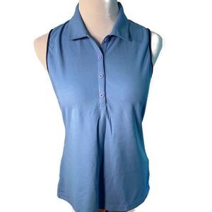 EP Enhanced Performance sleeveless, collared active top with front button closure, overall stretch and back opening. Great for golf or tennis! Armpit-to-armpit 21” and length 24”.