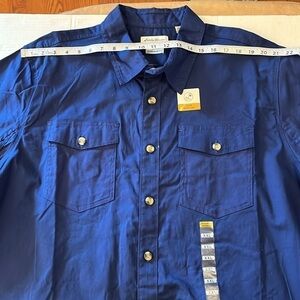 NWT-Eddie Bauer-2XL-Blue-short sleeve, stain resistant, button-down shirt. Two pockets in the front, a place to put a pen. Foreman fit. 98% cotton, 2% spandex. See photos for approximate flat measurements.