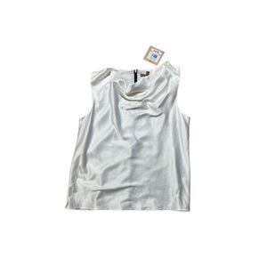 Brand new text from Ellen Tracey this is a sleeveless top with a back zip. This has a draped front and the back has a lace appliqué making this pretty dressy. This will look great with a skirt for work or with pants for an evening out. The fabric is a poly spandex blend that looks like satin very pretty! Machine washable brand new tags no flaws noted