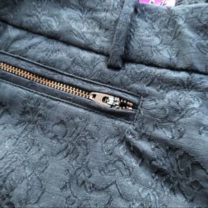 Mid rise, Fitted hip and thigh, Cotton, Poly and Spandex. Clasp and button closure on waistband. Comfy, embossed floral. Perfect for dress up or casual wear.