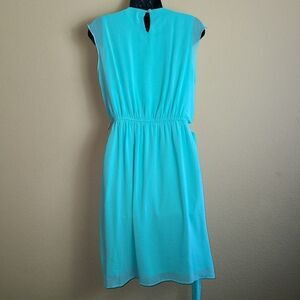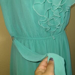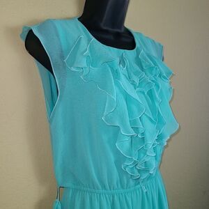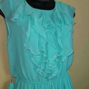This is a new with tags sleeveless dress by Emma Michele. It is mint colored and has an attached fabric belt. There is a keyhole opening on the back with a small button closure. On the front are ruffles, and the waist is elastic.