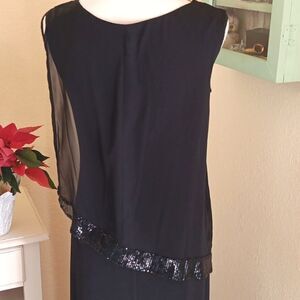 NEW. Pretty, classic evening dress with a sparkly cover. Long and slinky. Size 4 measures 34 at chest, 32 at waist, 38 at hips. 51 long from shoulder to hem. Easy and simple, and so elegant.