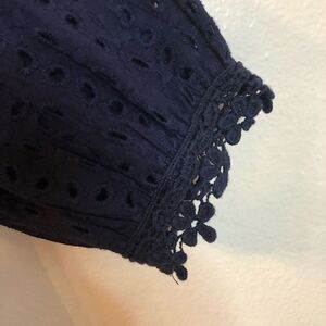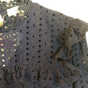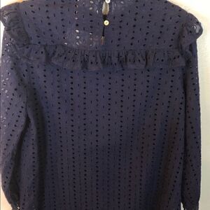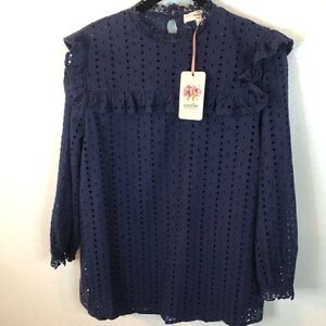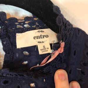 NWT Entro top. Blue eyelet body with pink crocheted lace at neck and wrist. Ruffle at chest and shoulders. Size small. 100% cotton. Length from shoulder to bottom is 25.5”. Armpit to armpit is 19”.