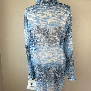 Gorgeous sheer light blue floral silk button down shirt measuring 20 inches armpit to armpit and 30 inches in length.