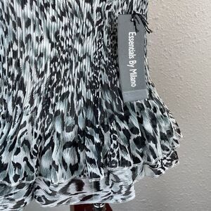 Super cute blouse top by Essentials by Milano featuring a slightly ruffled design at the shoulders and waist and animal print. It measures 16 inches armpit to armpit and 22 inches in length.