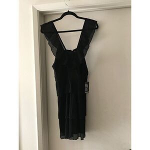 It has flutter sleeves, a triple tier ruffle body and a back hidden zipper and hook closure. It has lace,up detail at the plunge neckline with a front tie. The skirt is fully lined. Both the body of the dress and lining is done in 100% polyester. It is size Medium (8-10), measures 35.5” in length from the top of the shoulders to the bottom hem and 16” across from armpit to armpit when laid flat.