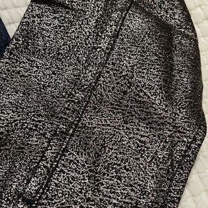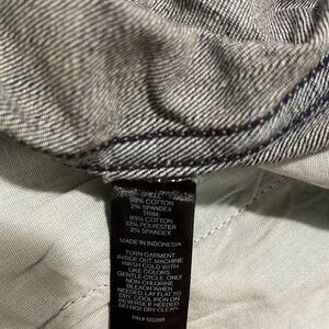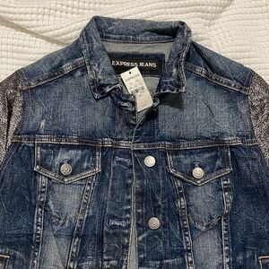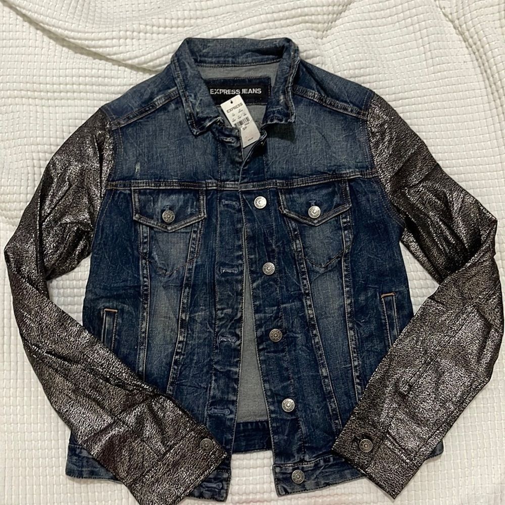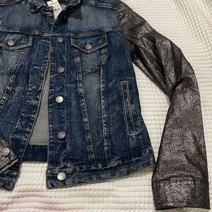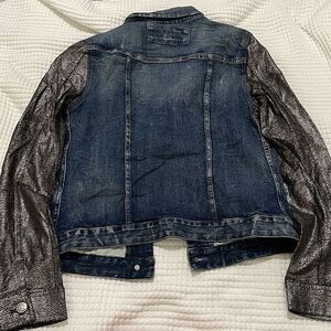 Distressed jean jacket with metallic silver & black shimmering sleeves