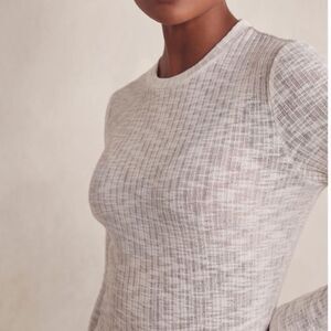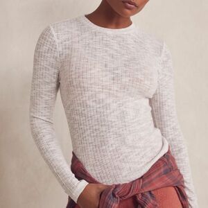 Cozy and essential, this made-for-layering top is featured in a semi-sheer, rib knit fabrication and slim crewneck silhouette for a season-spanning staple.