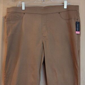 Elastic waist. Fits like a legging. Super skinny. Cotton blend with spandex for stretch. Real back pockets. Faux front pockets and fly. Pull on. Size 16 measures 38-42 at waist, 44 at hips, 11 inch rise, 30 inch inseam. Great looking.