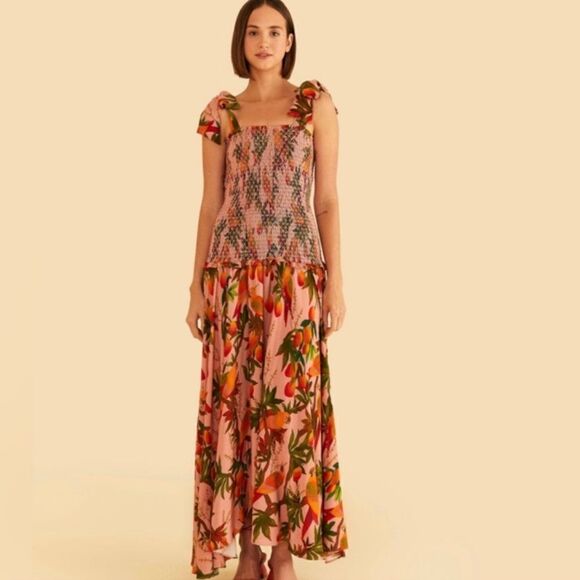Introducing this Farm Rio Pink Mango Trees Maxi Dress in a size medium! Experience the delightful fusion of your favorite fruit and the colors you adore in this must-have piece. This dress showcases a body-embracing bodice, adjustable shoulder-tie straps, a gracefully flowing skirt, and a print that adds a touch to your wardrobe.