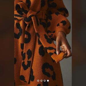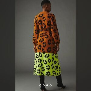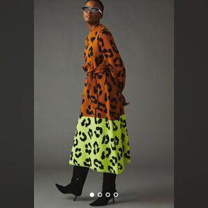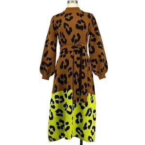 Chic sweater dress in midi length! Top 2/3 of dress is brown colorblock, while bottom 1/3 of dress is lime green colorblock (both colorblocks have black cheetah / leopard print pattern all over). Durable material keeps you warm during cold days. Soft & cozy fabric perfect for fall or winter. Great to layer with coats and jackets. Quality material stretches and retightens to hug your shape. RARE item! Sold out everywhere. Discontinued style. Smoke-free and pet-free home.