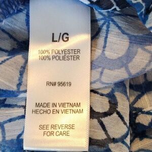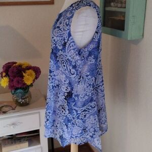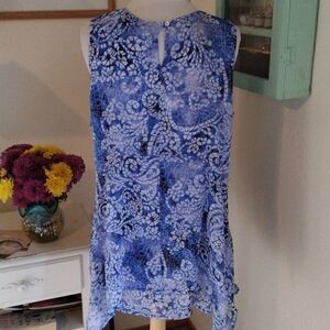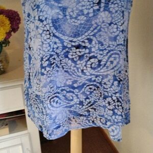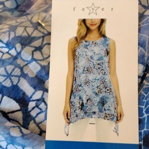 NWT Color: Blue Mosaic Glass. Two layers of slightly crinkly fabric in a loose shift shape. The top layer is longer on the sides. Keyhole closure at back neck. Size L measures 44 at chest, 52 at bottom hem. 32-35 long from shoulder to hem. Beautiful and NEW.