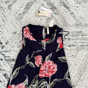 NWT Floral Dress with tie up sides! Brand new with tags! Awesome sides that tie and can loosen or tighten! Size says Small but would also fit a Medium!! Dress is Navy with green leaves and pink/red/Coral flowers! Perfect for summer or spring! Bundle for more savings! š