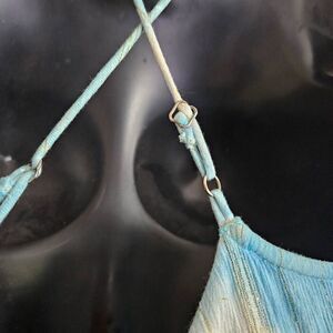 This is a new with tags maxi dress by Folkie. It is blue and white tie dye with gold tone metallic threads throughout. There is a cutout detail on the chest and adjustable criss-crossed straps. On the side is a zipper and around the waist is elastic smocking.