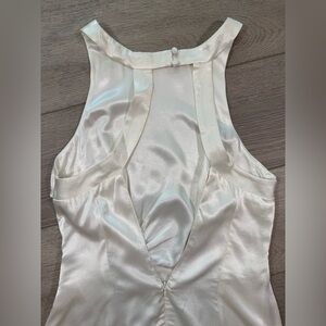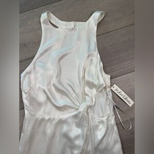 The perfect mix of sweet and sultry, this halter mini features a a side cutout with twist detail and mini thigh slit. Its slinky feel good fabrication is made from recycled materials. Made for the bride to be.