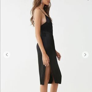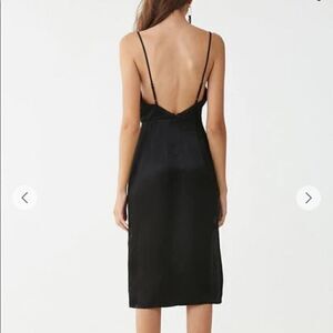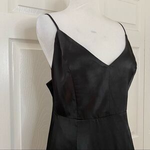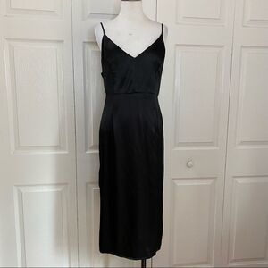 A satin woven knee-length dress featuring a V-neckline, adjustable cami straps, princess seams, concealed back zipper closure, single side slit, and subtly relaxed silhouette.