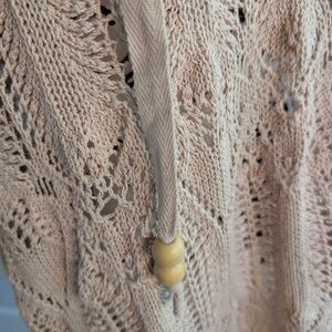 Stylish beige knit sweater with a hood. Features a delicate pattern and wooden bead accents.