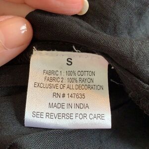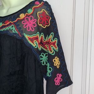 Free Generation Los Angeles black cotton/rayon boho blouse with brightly patterned design around neck & upper back