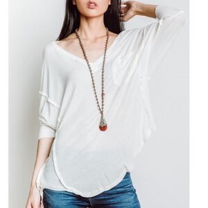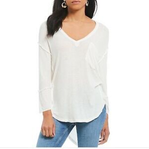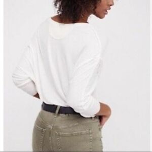 This oversized curved hem henley top is the perfect thing to wear for a stylishly laid-back look. Fit: this style runs large, order one size down. - V-neck - 3/4 length sleeves - Partial button closure - Raw edge seam detail - Curved hem -