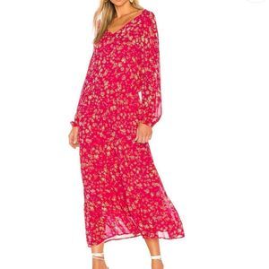 Flowy printed midi dress featuring cinched long sleeves and a gathered waist over a matching slip.