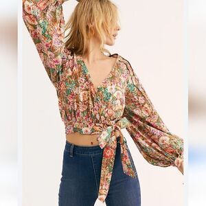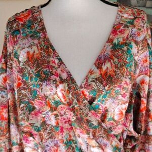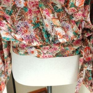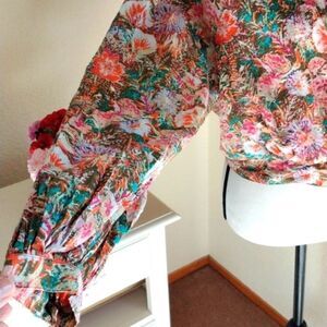 Boho floral with beautiful details. Wrap front with ties. Elastic shirring at back waist. Long puffy sleeves. Blousy and full, L measures 60 at chest, 36 at bottom hem plus elastic shirring, tie adjusts here. 22 long from shoulder to hem. This is a beautiful top for all year round.