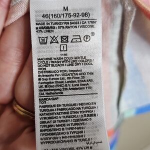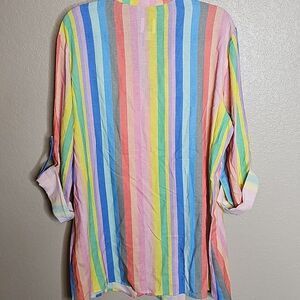 Bright and stylish striped shirt. Features a mix of vibrant colors. Ideal for a standout look. NWT GAP Linen Blend Rainbow Striped Shirt Long Sleeve Button Up Maternity Medium in excellent new condition EXCEPT missing a sash belt, still looks great without it!