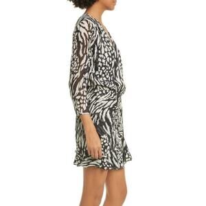 Black-and-white animal patterns silk-chiffon minidress with a blousy bodice and ruffly, drawstring-ruched skirt. about 36" length Surplice V-neck Three-quarter sleeves with rouleau-button cuffs Lined skirt 100% silk Dry clean