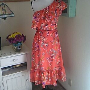 Beautiful persimmon orange floral dress. The top has a ruffle that goes over your shoulder. The shape is full, and you can wear it that way, super comfortable. I've included a matching belt, not original to the dress, but it works. It looks great belted too. Size S measures 36 at chest, 38 at waist when loose, 46 at hips. Pretty openwork above ruffle at hem. Beautiful saturated color, and NEW.