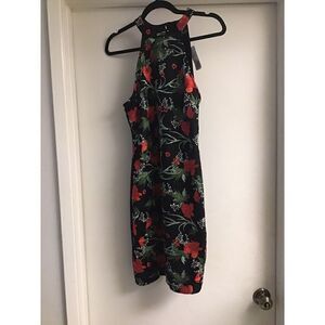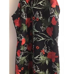 This dress is brand new and never worn with tags attached and it is gorgeous. It is midi style, which means it hits right at knee level. By Forever 21, the front of the dress has a black base and has a stunning embroidered floral design all over. The back of the dress is a solid cottony stretch material. The cut out shoulders lead to a high neck collar that closes with two buttons at the back of the neck. It is size Large, measures 38” in length from the top of the shoulders to the bottom hem and 16.5” across from armpit to armpit when laid flat.