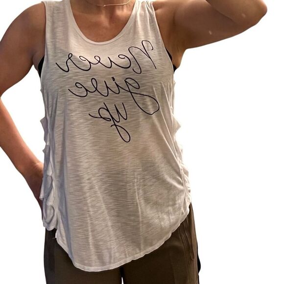 NWT Graphic “Never Give Up”Women's White Graphic Woven Side Tank Top L