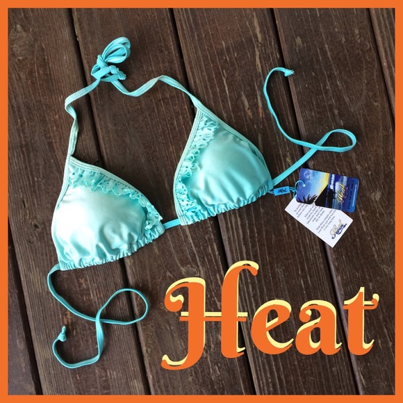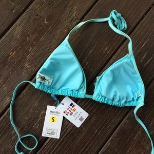 Darling triangle string bikini top in shimmering turquoise features eyelet ruffle trim and original removable light padding. Size small.