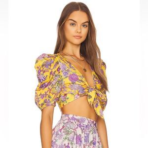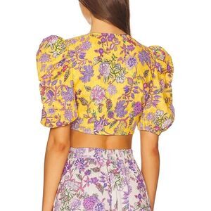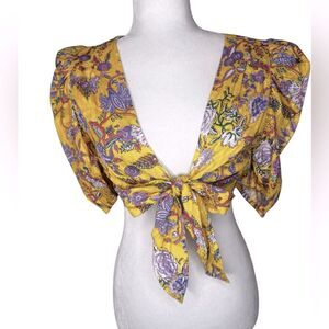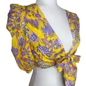 NWT HEMANT and NANDITA Dhea Crop Top Tie-Front Canary Yellow Boho Floral Medium