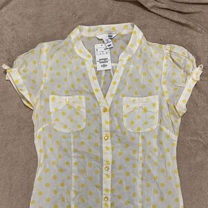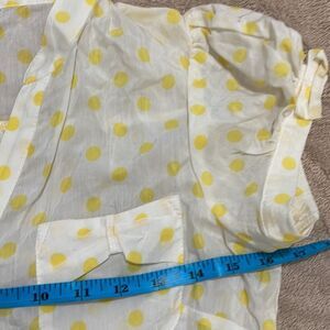 Cream with yellow polka dots, v cut button down, accent bows, semi sheer