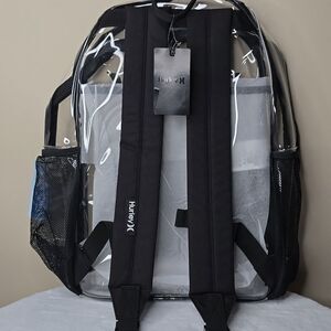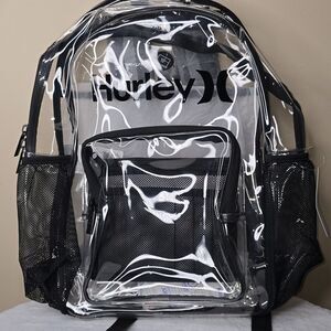 Hurley Transparent Day Backpack. Getting ready for school has never been so fun! With the Hurley Transparent Day Pack, you have all the space you need for your books, laptop, and other everyday essentials. The adjustable shoulder straps allow for a comfortable fit, while the top handle makes the backpack easy to carry. Transparent polyurethane material. Zippered front pocket with mesh organizer, two side bottle pockets, interior laptop pocket. Signature logo on the front panel. Approximately 21 liter capacity. Approximately 6 x 12 x 18 inches