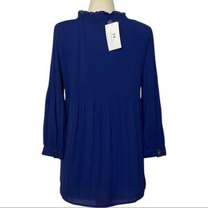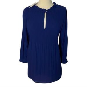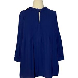 Halston NWT Blue Ruffle Mock Neck Accordion Pleat Boho Peasant Long Sleeve Blouse. Really darling! Size small. Ruffled neckline with button keyhole detail. Subtle babydoll pleated style. 3/4 sleeves. Flowy. Lined. Brand new. Never worn. Tags attached. No flaws. Laying flat, buttoned, unstretched: P2P- 20.5” W- 20.5” L- 27.5”