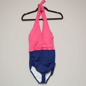 Pink and navy blue halter style one piece swimsuit Crossover front. Removable pads tummy control, adjustable tie