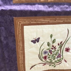 Brand new. Hand crafted and quilted with all new 100% cotton fabrics. Made in a smoke free home. This beautiful wall hanging features four nature vignettes and uses plums, purples, brown and greens. Each is framed by gorgeous stitching work on the cream backgrounds along with 3 additional borders. You really need to zoom in to see the quilting work on the piece, which includes a touch of metallic thread in purple!. It measures approx. 25” x 22 1/2”. Reverses to a tan leaf print.